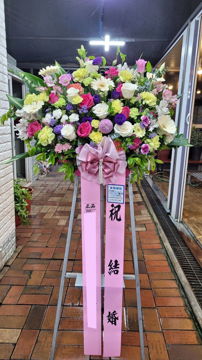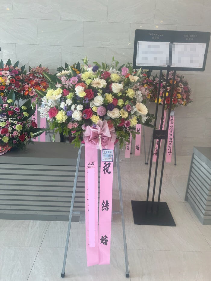 결혼식 화환은 결혼식 1시간 전에 배송되어 하객을 맞이합니다