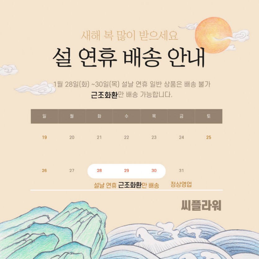 1월 28일(화) ~ 1월 30일(목)까지 설날 연휴기간 일반 상품은 배송 불가하며