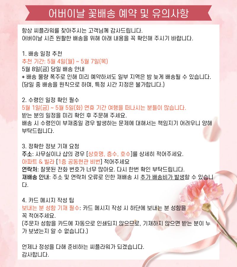 어버이날 시즌 원활한 배송을 위해 아래 내용을 꼭 확인해 주시기 바랍니다.