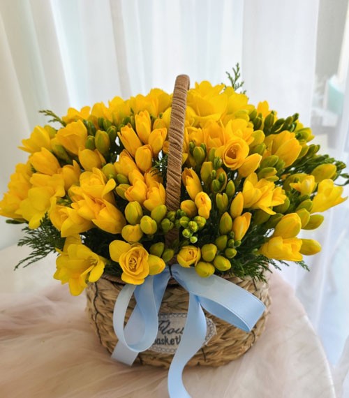 향기로운 노란 후리지아 꽃바구니입니다.