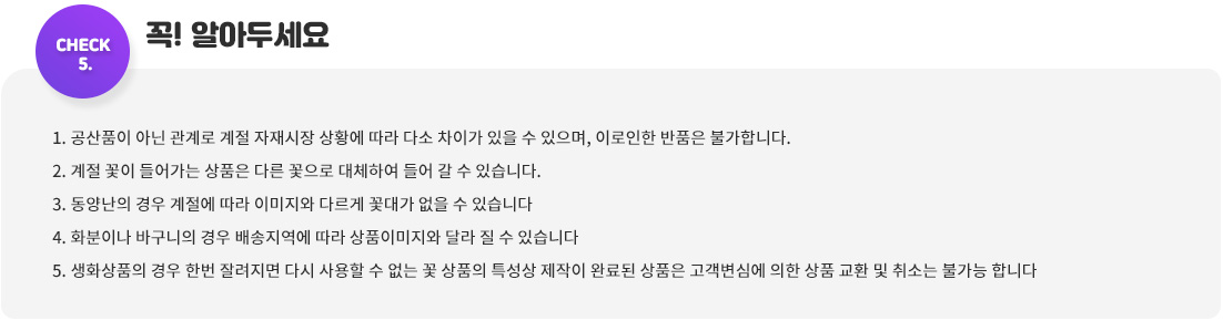 * 모든 상품은 배송지 인근에서 제작 배송됨으로 계절 및 꽃도매시장, 자재시장의 수급 상황에 따라 국산과 수입산이 혼용 사용될 수 있습니다.