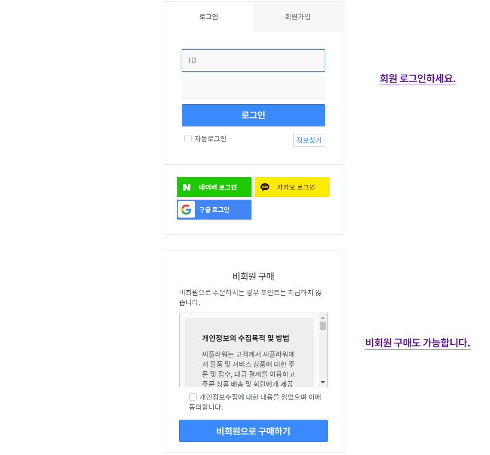 2. 회원 로그인 / 비회원으로 구매를 원하시면 비회원으로 구매하기 클릭합니다.