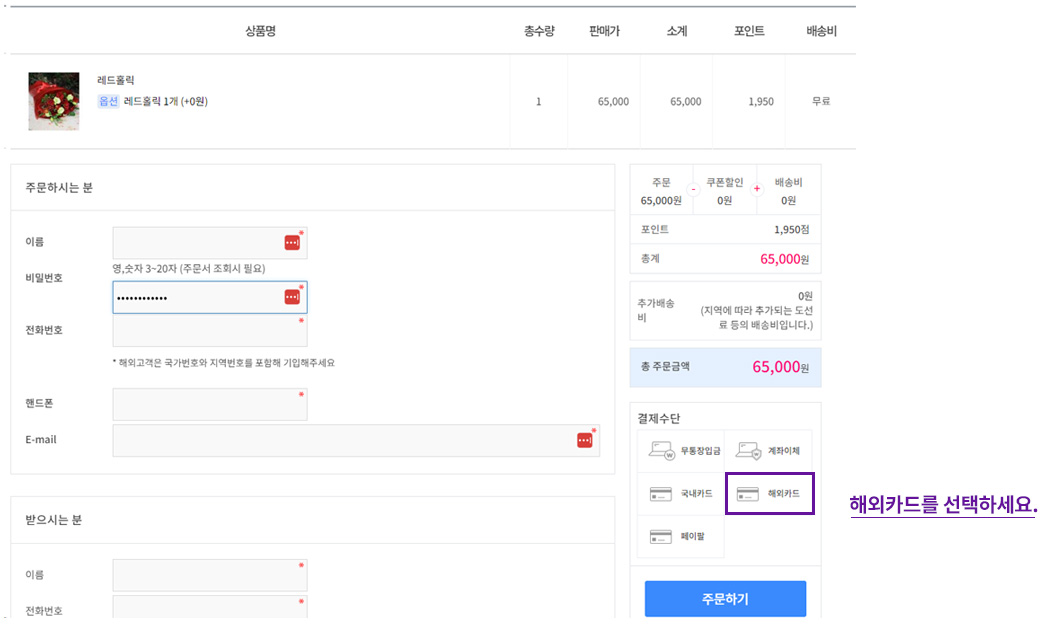 결제수단을 [해외카드]을 선택하여 [주문하기]를 클릭합니다.