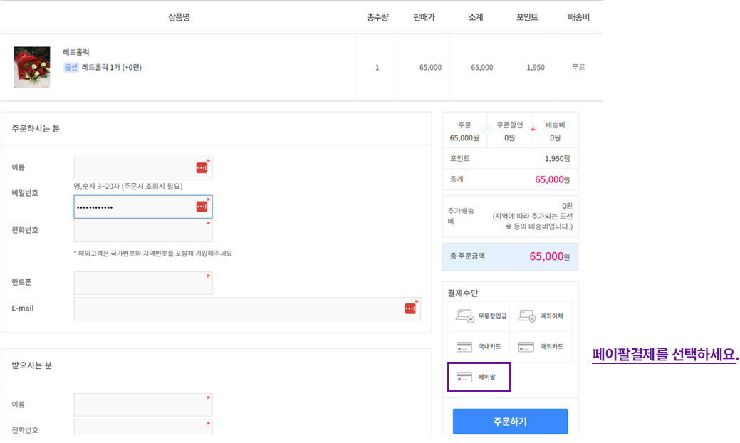 결제수단을 [페이팔]을 선택하여 [주문하기]를 클릭합니다.
