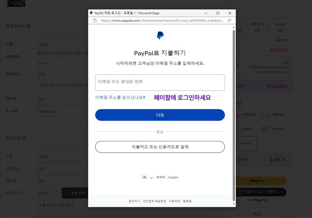 4. 페이팔 회원인 경우에는 로그인해서 등록되어 있는 카드로 결제합니다.