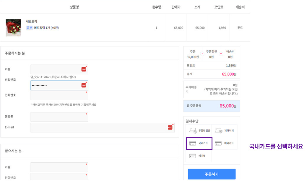결제수단을 [국내카드]을 선택하여 [주문하기]를 클릭합니다.