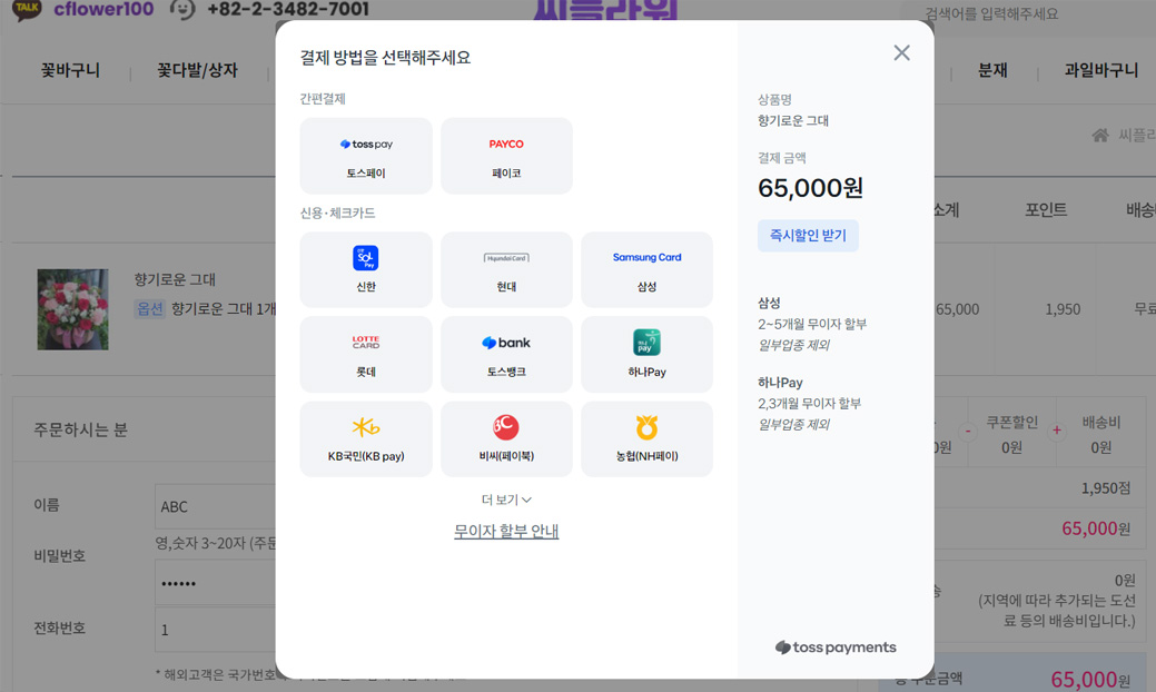4. 새창이 뜨면 토스페이를 누르고 카드종류에서 원하시는 카드를 선택하여 결제하시면 됩니다.